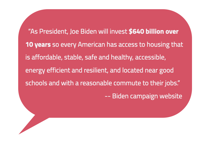 For housing specifically, Biden has pledged $640 billion in investments over the next 10 years. His website claims this will be paid for by raising taxes on corporations and large financial institutions.