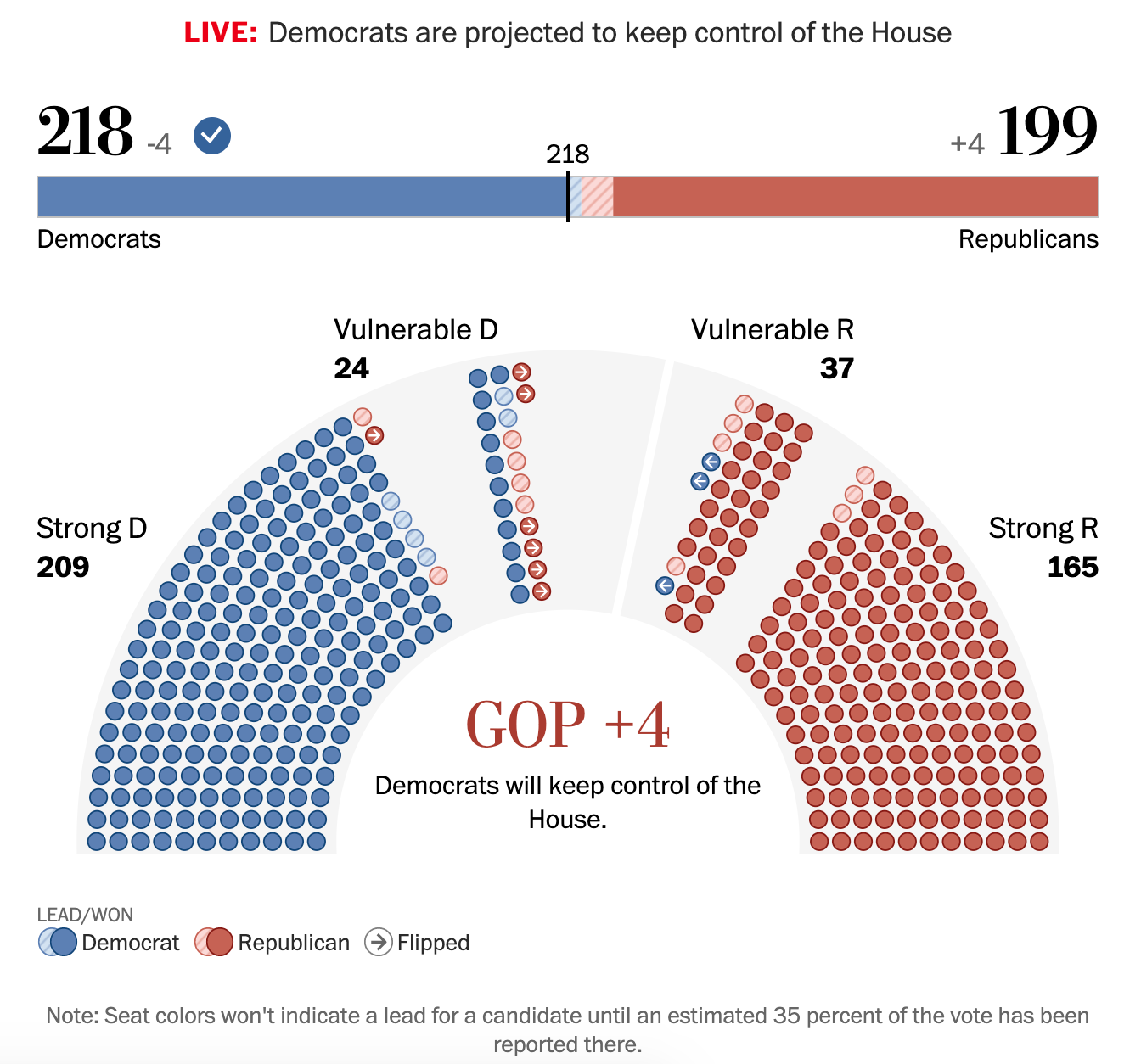 Also a close race, having a Democratic majority now does not mean it will stay that way. How well the new administration’s policies are received may very well impact the House distribution in 2022 and could very well result in a flip of power.