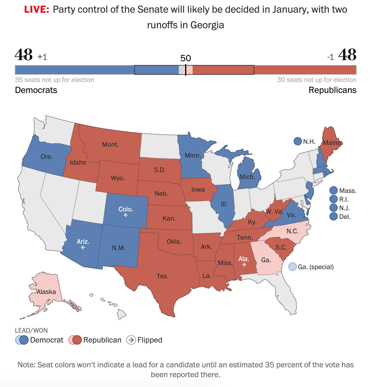 The White House will have limited power with a Republican Senate majority and specifically, the reputation of Senate majority leader Mitch McConnell to contend with. Senator McConnell has an obstructionist record under Obama where he opposed and blocked Democrative legislation, including nominations for administrative positions (cabinet secretaries, district court judges, and US attorneys). His recent support of President Trump’s legal challenges, saying that Trump is “100 percent within his right” to pursue recounts and litigation, may be a foretelling of things to come.