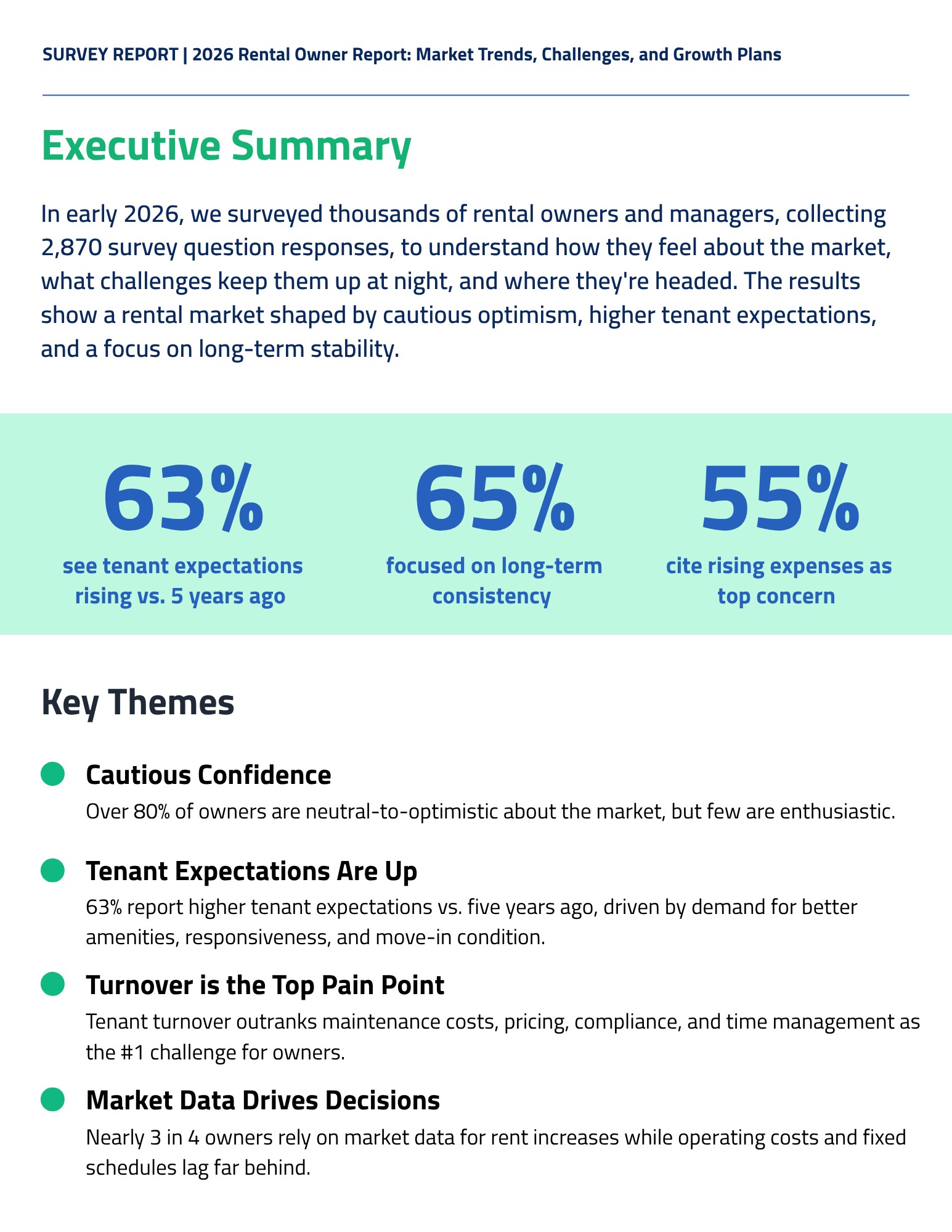 Instead, this survey shows a group of rental owners and managers who are staying practical and focused. They are using market data to guide pricing. They are paying attention to tenant experience. They are concerned about costs, but many are still planning to grow. Most of all, they are thinking long term.