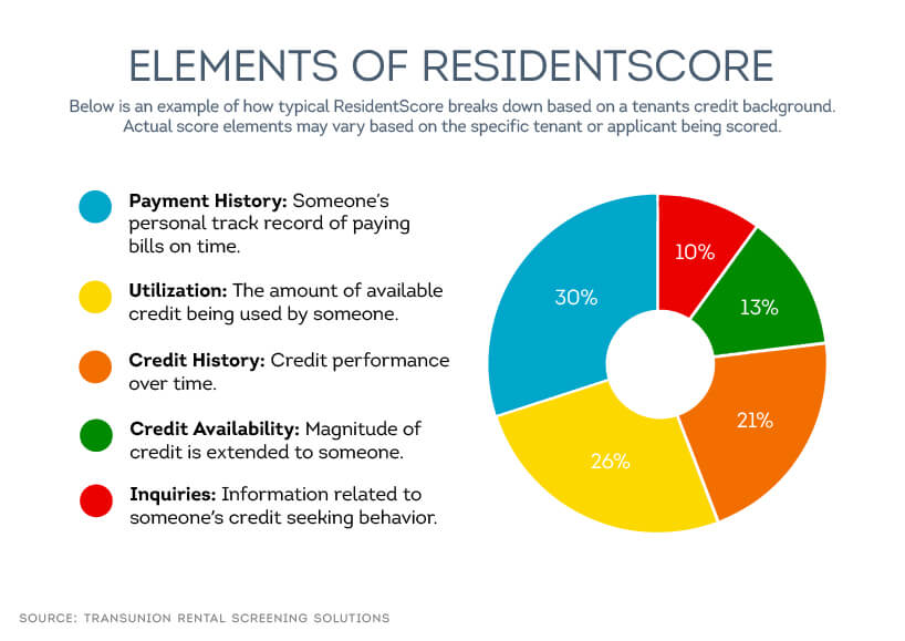 The credit score itself measures the reliability of the applicant and is the most important metric in the report. For the latest benchmarks and data, see our tenant credit insights based on Hemlane's nationwide screening data. TransUnion’s ResidentScore is probably the most accurate credit score, since it is specific for rental properties. The ResidentScore is based on the same elements of a traditional credit report, but with the weight of each component specific to the ability to pay rent. According to TransUnion Rental Screening Solutions analysis, 24% of residential property rentals have bad outcomes. This data is factored into the formulation of a ResidentScore. Red flags for tenants that are not accepted include: Evictions, 3+ late payments, and/or insufficient funds.