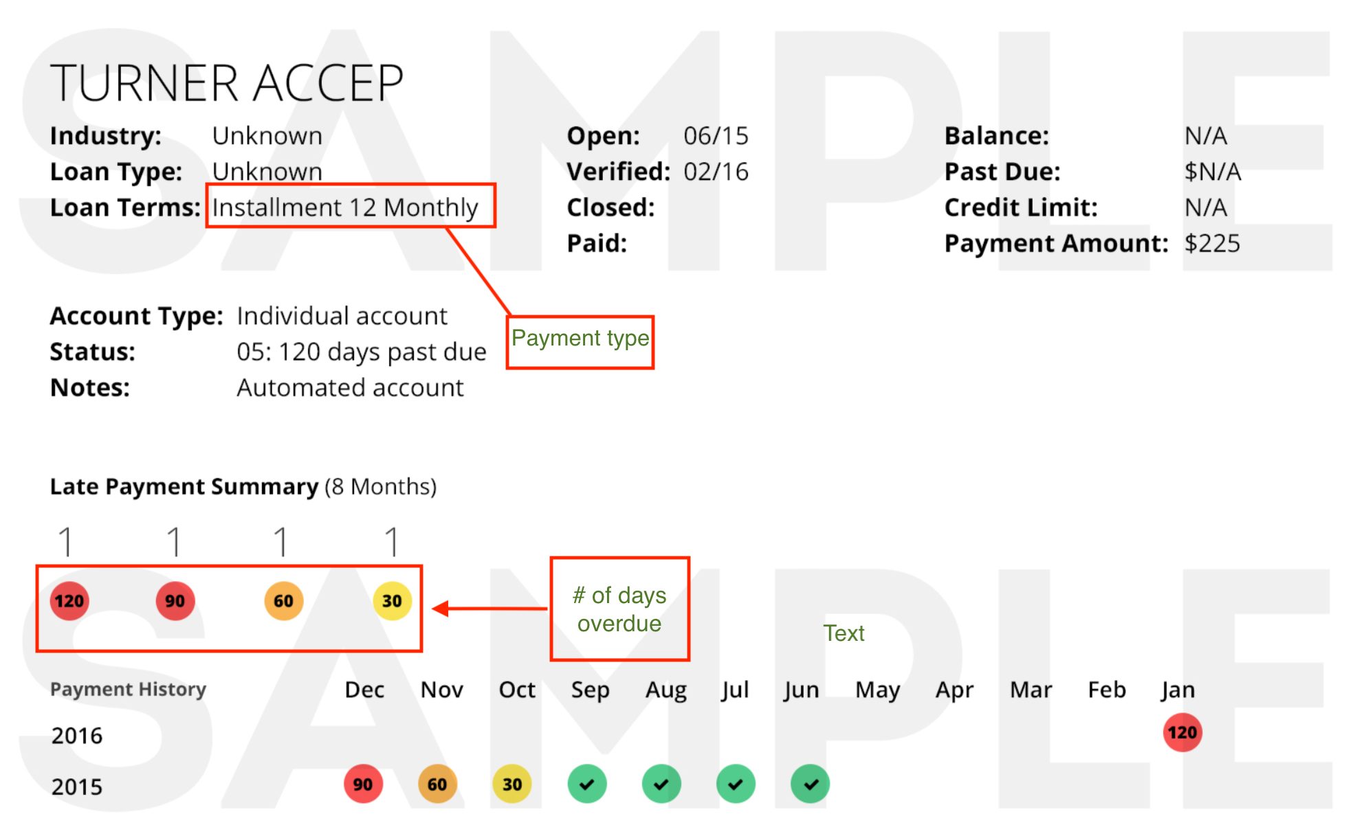 Below you can see this applicant has been late on their payment for over 120 days. The circles indicate the number of days overdue.