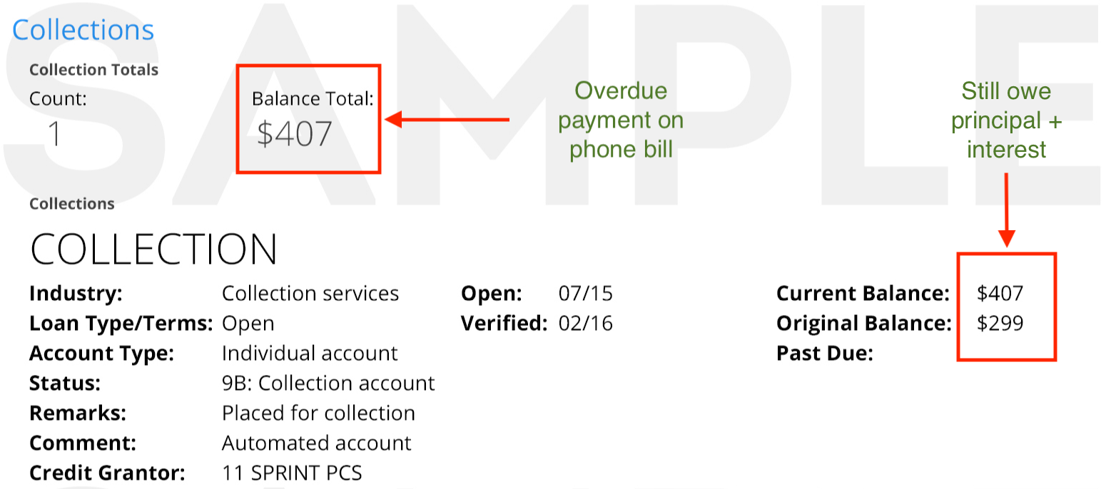 A collection is when the tenant has not paid their debt. This can significantly lower their credit score. Several accounts out for collection denotes an increased likelihood of an unreliable applicant.
