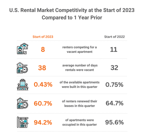 Since last year, the US rental market has cooled with fewer applicants per available rental. Average vacancy also increased by 6 days, making it more attractive for landlords to incentivize existing tenants to renew. Read more here. If you’re in the process of finding your next tenant, check out Leasing+ and Agent+ to close a qualified tenant faster.