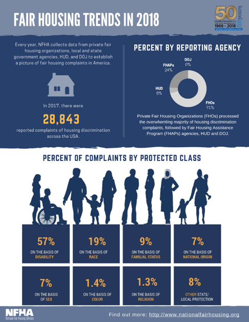 Nationwide the Fair Housing Act protects people from discrimination in housing against race, color, national origin, religion, sex, familial status, and disability. Landlords must ensure that they do not discriminate with their tenant selection process, accommodate people with disabilities, advertise appropriately, and do their research on protected classes. In 2018 the largest percentage of Fair Housing complaints filed were on the basis of disability.