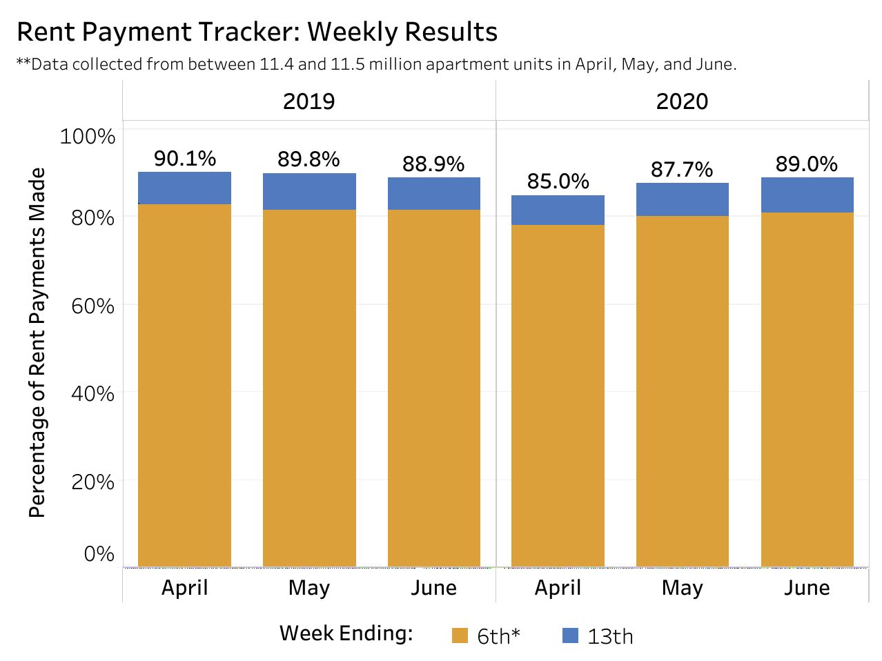 The National Multifamily Housing Council (NMHC)’s Rent Payment Tracker surveyed 11.5 million professionally managed apartment units across the country and found 80.8 percent of households made full or partial rent payment by June 6, compared with 80.2 percent by May 6 the previous month. By May 27, this number was up to 93.3 percent and we could very well see similar numbers for June.