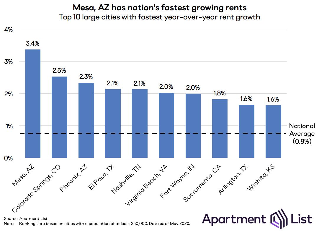 According to Apartment List, while rents are increasing at the slowest pace they have in the last 5 years, they are still outpacing the Consumer Price Index at 0.8% compared to 0.3%, on average. Below are 10 cities experiencing higher rent growth than the average, with Mesa currently at the top.